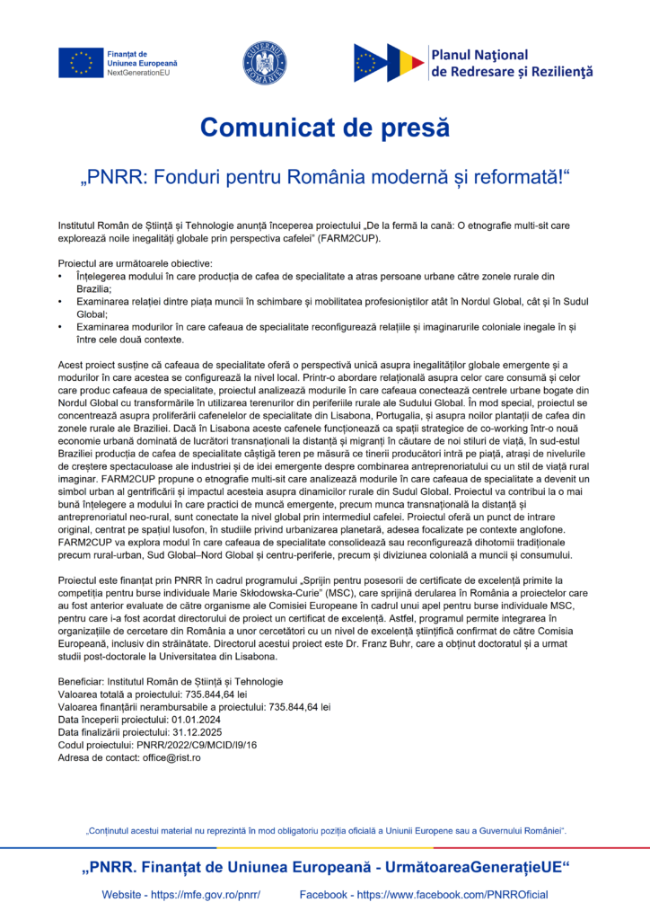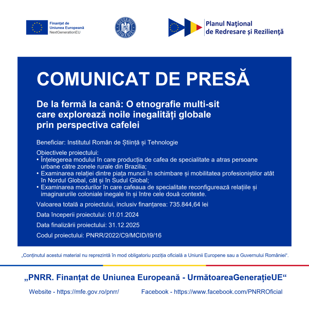 Institutul Român de Știință și Tehnologie anunță începerea proiectului „De la fermă la cană: O etnografie multi-sit care explorează noile inegalități globale prin perspectiva cafelei” (FARM2CUP).